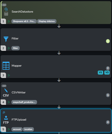 und zwar habe ich einen relativ normalen Flow. Ich greife die Datensätze im Datastore ab, habe einen Filter, um Datensätze einzugrenzen, verarbeite sie in einem Mapper (Datenmanipulation) und mache dann eine CSV-Datei daraus. Das klappt wunderbar.