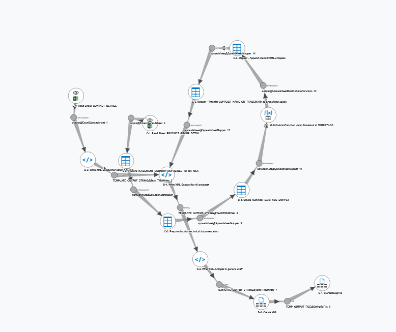 Das Hauptproblem aktuell ist, dass der Graph nur die direkten Step-Verknüpfungen anzeigen kann. Alles was du mit Freemarker Variablen z.B. im Mapper oder TextHTML Writer machst (durch Verwendung von z.B. ${flowVariable} etc. wird nicht erkannt.