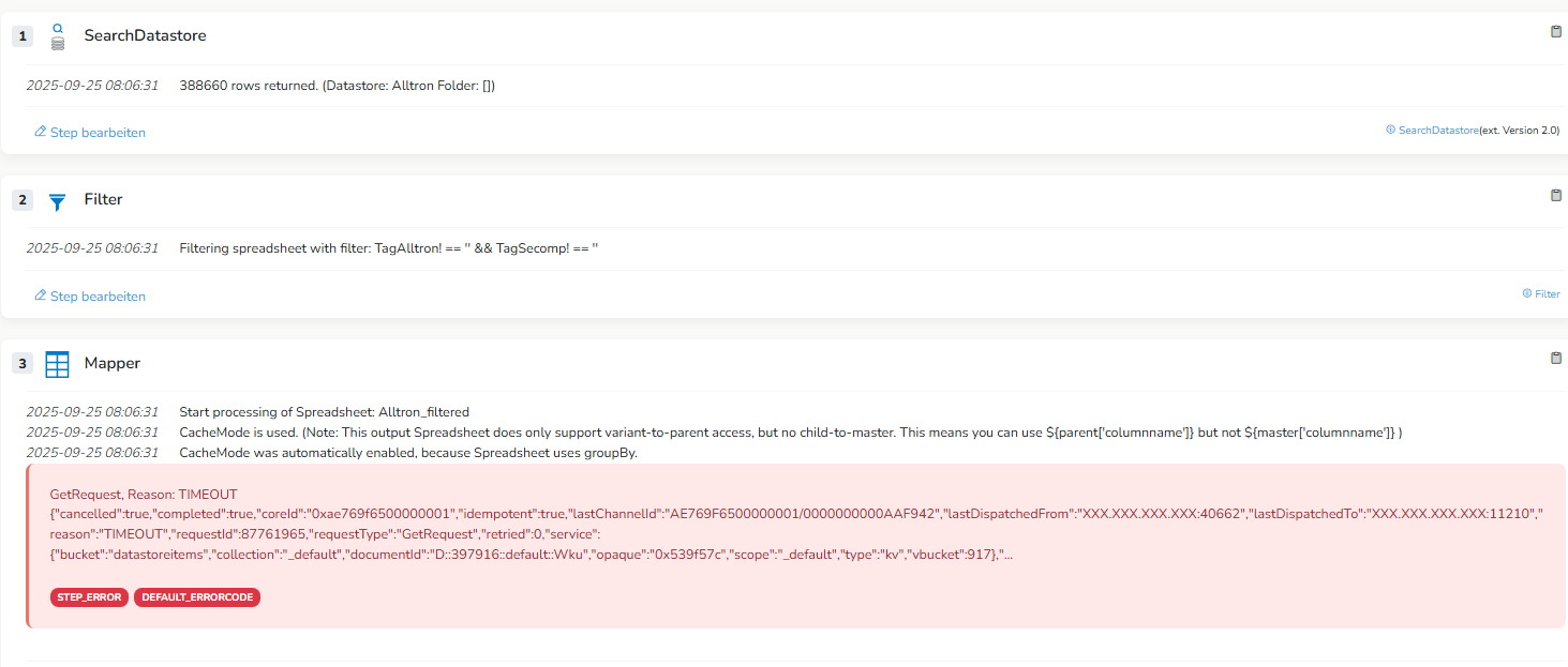 bei uns kam es heute Nacht ebenfalls zu einer Reihe von Timeout-Flow-Abbrüchen in Verbindung mit dem SearchDatastore-Schritt, dem SpreadsheetUrlDownload-Schritt und dem SpreadsheetDatastoreWriter-Schritt.