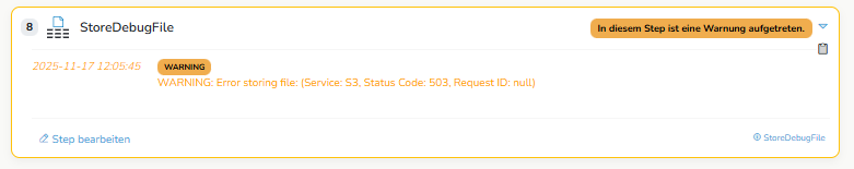 wir hatten leider zwischen ca. 12:05 - 12:12 Uhr ein Problem beim Speichern von Dateien. Das hat unter anderem zu diesem Fehler im StoreDebugFile Step geführt.