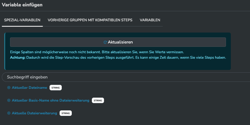 den Dateiname (outputFileName) kann aktuell nur auf Basis des input-Dateinamens festlegt werden. Dafür stehen die drei FM Variablen zu Verfügung (siehe Screenshot).