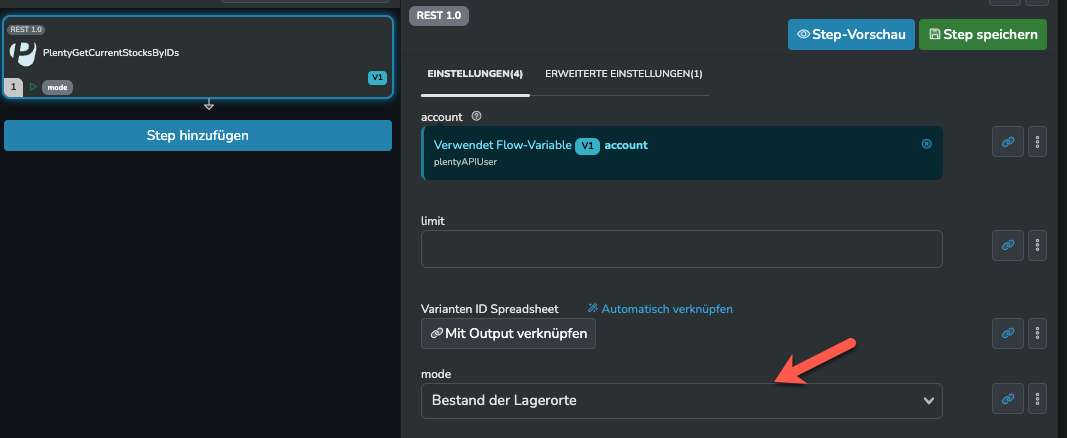 Der PlentyGetCurrentStocksByIDs Step hat jetzt noch eine Auswahl Modus bekommen. Damit kannst den „Bestand der Lagerorte“ abrufen.